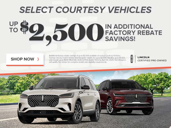 Additional factory rebate savings of up to $2,500 available on select Courtesy Vehicles. Savings vary by model: Aviator and Navigator eligible for up to $2,500, Nautilus up to $1,500, and Corsair up to $500. Must take delivery from dealer stock by April 30, 2026. Not all buyers will qualify. See dealer for complete details and eligibility requirements.